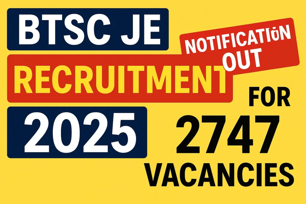 BTSC JE Recruitment 2025 बिहार के उन युवाओं के लिए सुनहरा अवसर है जो इंजीनियरिंग क्षेत्र में सरकारी नौकरी की तैयारी कर रहे हैं। कुल 2747 पदों पर भर्ती के साथ यह राज्य की बड़ी भर्तियों में से एक है।